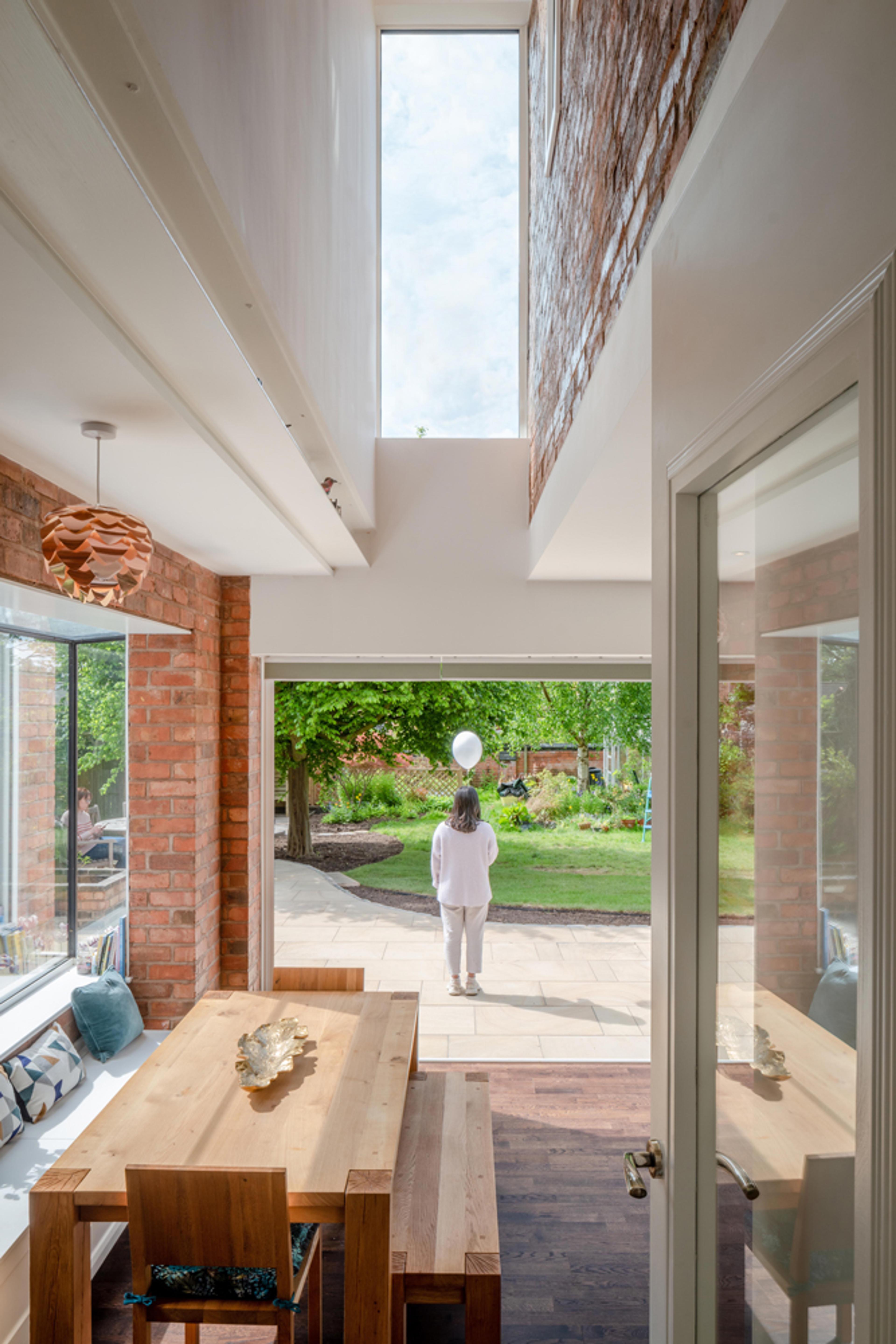 The proportion and positioning of a double height slot window and new oriel window creates opportunity for thermal mass, which in the winter reduces energy consumption, as the void is connected to an upper level window allowing air movement through the main spaces and roof outlets.